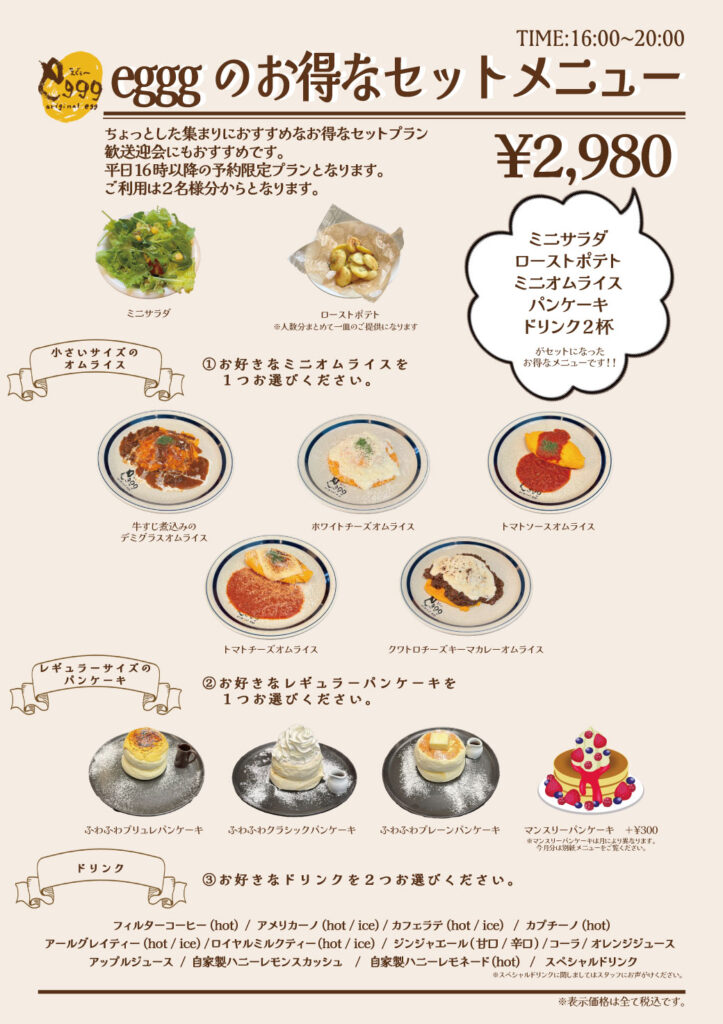2026.03.18 卵屋さん日記🥚 本日のeggg のお話。本日は、eggg parkでスタートしたお得セットについてご紹介します😊3月4月は、異動があったり、新しい出会い別れがあったりと、なにかと動きがある季節ですね🌸egggでは、そんな歓送迎会におすすめなお得なセットメニューをご用意しました😊 ※下記画像参照 平日16時以降、予約制になっております!ぜひこの機会にegggをご利用下さいませ!!ご予約お待ちしております😊 2026年3月18日 投稿先 Uncategorized ← 過去の投稿へ コメントを残す コメントをキャンセルメールアドレスが公開されることはありません。 ※ が付いている欄は必須項目ですコメント ※ 名前 ※ メール ※ サイト 次回のコメントで使用するためブラウザーに自分の名前、メールアドレス、サイトを保存する。 上に表示された文字を入力してください。 Δ